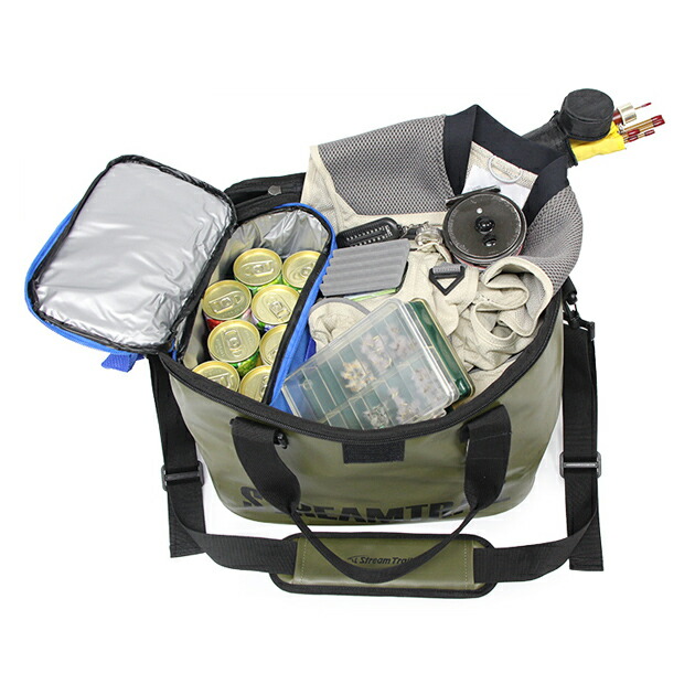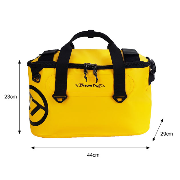 メインルーム、フロントポケット共に完全100%防水使用。ワンショルダータイプの Stream Sider はタックル、ギアなど必要なものを十分に収納できるだけの容量を確保し ています。 |