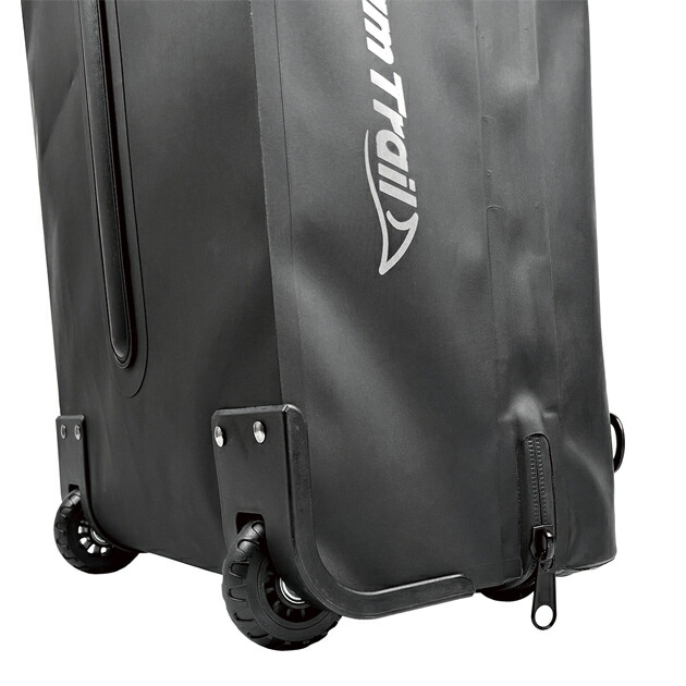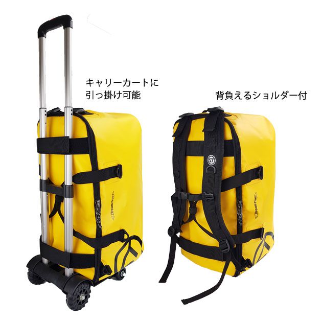 タフで防水性の高いTPU素材を使用しています。シーリングによる防水加工。95Lの大型トローリーバックは引っ張るだけでなく、ショルダーストラップや、バックパックストラップも備えていますので、狭い場所や階段などでの移動にも対応できます。初代モデルからアップデートを加え、擦れに強い厚い生地をレイヤードすることで、バックを立てかけた際のボトムの擦れやダメージを避けれるように強化しました。 |