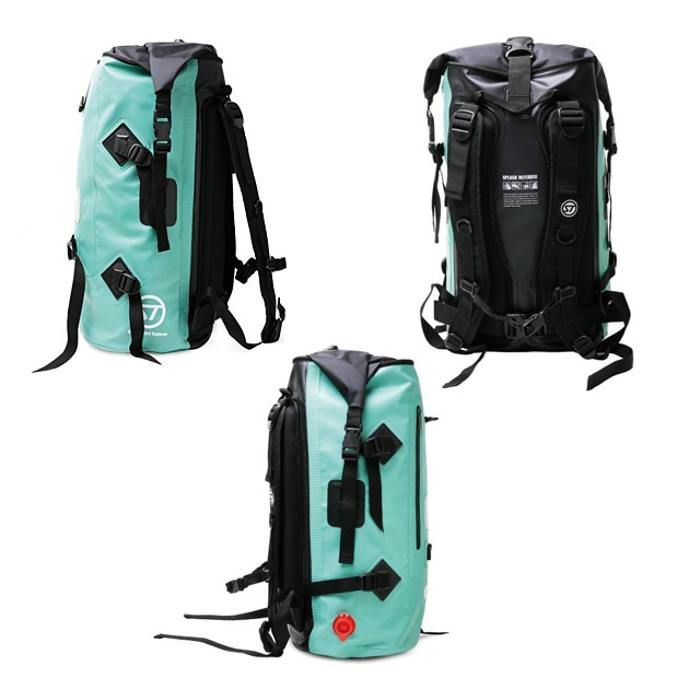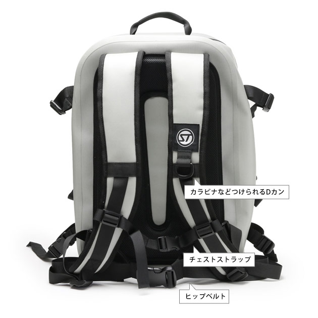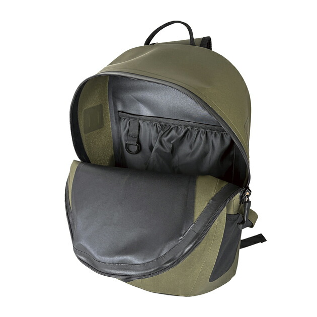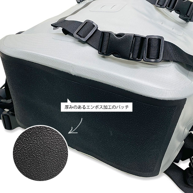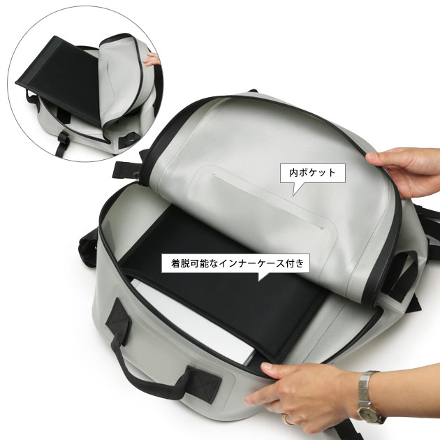 メインルーム、フロントポケット共に完全100%防水使用。アクティビティーの際の不意 の水没、激しい雨や潮被りにも対応できす。 |