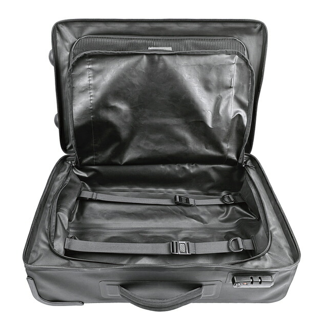 機内持ち込み対応サイズのキャビントローリー「IZUMO」。KAGAと同じく防水性の高いTPU素材を採用し、シームシーリング加工で雨天時も安心。フルジップの観音開き構造で、荷物の整理がしやすいデザインです。左右にはファスナー付きメッシュパーテーション、荷物固定ベルトを装備。TSダイヤルロックも搭載し、旅先でも安心して使用できます。ハンドルは2段階調整で、身長やシーンに合わせて快適に操作可能。 |