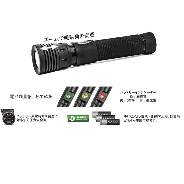 ●光束: 285 ルーメン(100% / 30% / SOS)●照射角: 9度 ●点灯時間: 3時間